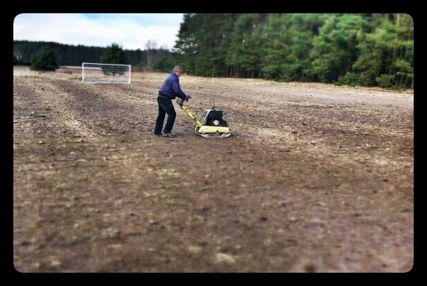 Heute hat Achim einen Rüttler besorgt und schiebt fleißig über den Fußballplatz damit der Boden fest wird!