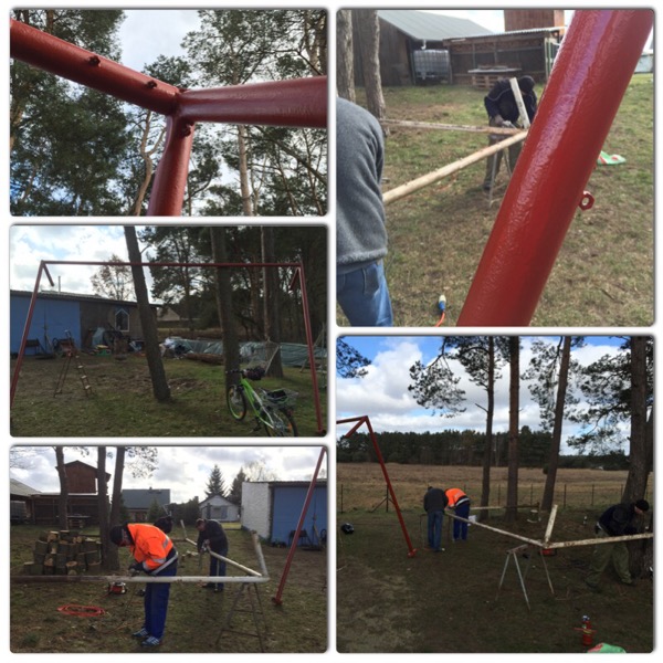 Heute bei schönstem Wetter haben die Fußballtore ihren weißen Anstrich erhalten! Wenn es so weitergeht, können die Tore wohl bald aufgebaut werden.